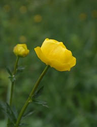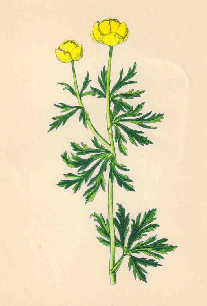 Je to vytrvalá bylina s přímými, až 60 cm vysokými lodyhami. Tmavozelené listy jsou hluboce třikrát až pětkrát dlanitě dělené s úkrojky trojčetnými a opět hluboce zubatými. Dolejší listy mají dlouhé, hořejší kratší řapíky. Nejhořejší listy jsou přisedlé. Květy jsou nápadně kulovité, velké - mají až 3 cm v průměru - a leskle zlatožluté. Kališní lístky jsou také žluté a někdy trochu nazelenalé. Kulovitě uzavřený květ chrání svoje hojné tyčinky a pestíky před deštěm. Plody jsou podlohlé měchýřky s malým zobánkem a četnými černými semeny. Kvete od května do června.