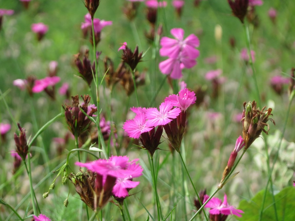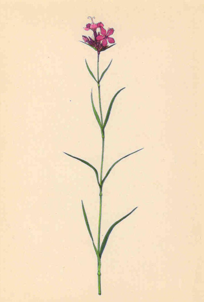 Je to vytrvalá, hustě trsnatá, až přes půl metru vysoká rostlina s krátkými nekvetoucími a dlouhými kvetoucími lodyhami. Lodyhy jsou nevětvené. Listy jsou čárkovité, naspodu pochvovitě srostlé, tuhé a špičaté. Téměř přisedlé květy jsou červené a sestavené do dvoukvětých až šestikvětých strboulovitých svazečků. Podkališní listence jsou kožovité, hnědé až načervenalé, dlouze osinkatě špičaté a kratší než válcovitý, červenavě naběhlý kalich. Korunní plátky jsou na líci chlupaté, červené nebo růžové, na okrajích zubaté. Plody jsou podlouhlé tobolky s mnoha semeny. Kvete od června do září.