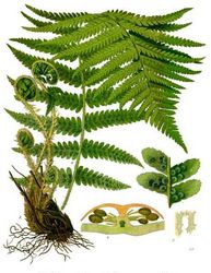Jedná se o hustě trsnaté byliny s mohutným, hustě plevinatým, vystoupavým, až 20 cm dlouhým a zpravidla jednohlavým oddenkem. Všechny listy jsou přibližně stejného tvaru a zpravidla nepřezimují. Jsou hustě nálevkovitě rozložené, přímé, 25 - 100 cm dlouhé a 10 - 18 cm široké, měkké, zelené až tmavě zelené. Čepel je podlouhle kopinatá až široce podlouhlá, k vrcholu nejčastěji pozvolna zúžená, 1 - 2x zpeřená, s 18 - 25 lístky na každé straně. Hlavní vřeteno listu je roztroušeně světle hnědě až hnědě plevinaté, lístky střídavé, víceméně přisedlé nebo velmi krátce řapíčkaté, kopinaté až podlouhle kopinaté, 4-6x delší než široké, s 10 - 20 úkrojky či lístečky na každé straně, s okraji rovnoběžnými nebo k vrcholu se sbíhajícími, po celé délce vroubkovaně až pilovitě zubatámi. Lístky na spodní straně, zvláště na žilkách plevinaté. Řapík silný, nelámavý, z déli čtvrtiny až poloviny čepele, žlutavý s tmavě zbarvenou rýhou na líci, hustě světle hnědě až hnědě plevinatý. Pleviny jsou matné, až 2 cm dlouhé, na vrcholu dlouze zašpičatělé. Výtrusnicové kupky jsou velké cca. 1,5 mm v průměru, po 4-6 na každém lístečku nebo úkrojku lístku. Ostěry ledvinité až okrouhle ledvinité, tuhé, lysé, ploché nebo slabě prohnuté (ne však pod výtrusnicové kupky zahrnuté). Ve výtrusnicích je zpravidla 64 výtrusů, které zrají v červenci až září.