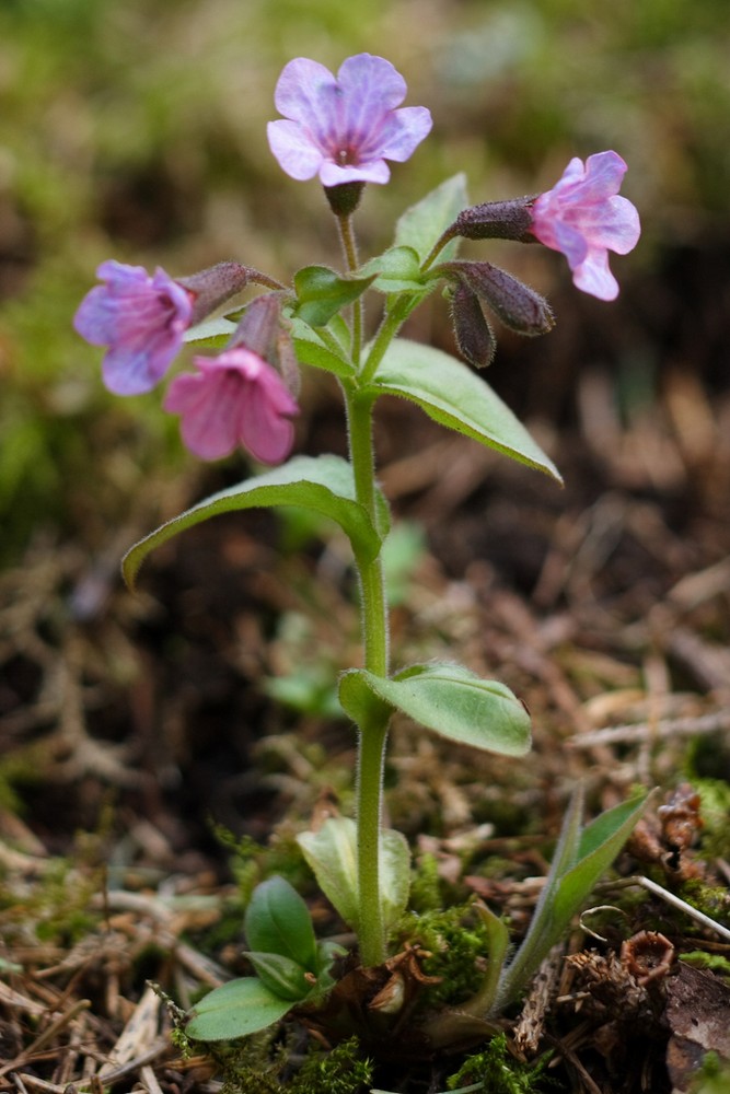Je to vytrvalá bylina s poměrně tenkým, rozvětveným oddenkem a lodyhami 10 - 30 cm vysokými, chlupatými, přímými a jen nahoře rozvětvenými většinou ve 3 vijany. Pět až sedm lodyžních listů je úzce vejčitých až kopinatých, skoro přisedlých, 4 - 6 cm dlouhých, 1 - 2 cm širokých. Přízemní listy v růžici se vyvíjejí zároveň s květními lodyhami a jsou 4 - 12 cm dlouhé a mají dosti dlouhé řapíky, na líci opatřené hlubokým žlábkem a kratší nebo stejně dlouhé jako čepele, jež jsou vejčité, na konci špičaté, naspodu skoro srdčité nebo uťaté, 2 - 5 cm široké, dosti tmavě zelené, bez bělavých skvrn, s žilnatinou zpeřenou a jen někdy podle žilek světlejší, dosti měkce chlupaté. Květy skládají vijany. Jednotlivé kvítky mají kalich 6 - 8 mm dlouhý, za plodu prodloužený až na 12 mm, do třetiny až poloviny rozdělený v pět cípů. Nálevkovitá koruna je červenofialová, 13 - 18 mm dlouhá, v ústí s chomáčky chlupů, rozdělená v pět zaokrouhlených cípů. Pět tyčinek je kratčích než trubka koruny. Jejich nitky jsou krátké. Semeník nese čnělku s hlavatou bliznou a mění se za plodu ve 4 tvrdky, jež jsou 3,5 - 4 mm dlouhé, leskle hnědé až černé. Kvete od března do května.