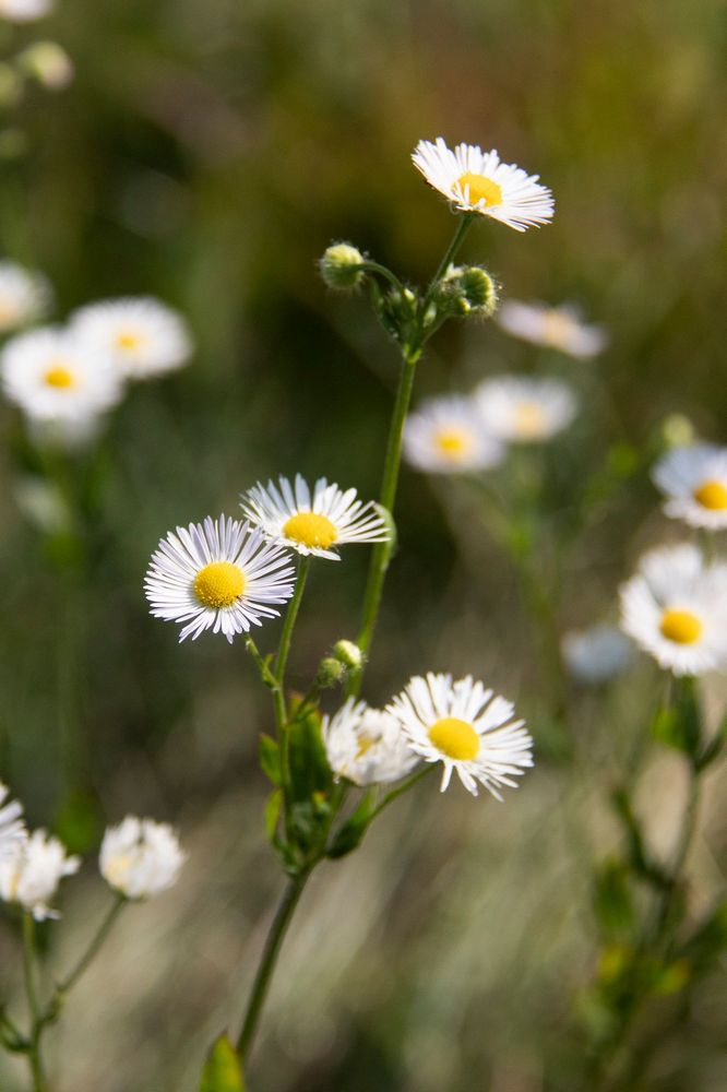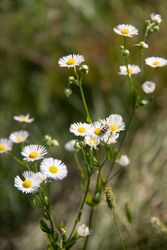 Úbory na stopkách s krátkými chlupy měří v průměru 1,5 až 2,5 cm a bývají sestaveny do chocholíkových lat. Oboupohlavné trubkovité pětičetné terčovité květy se žlutými korunními lístky jsou velmi početné. Rovněž jsou četné ve dvou řadách umístěné vnější samičí květy s jazykovitými korunami barvy bílé, namodralé nebo nafialovělé, které jsou dvakrát delší než zákrov. Polokulovitý zákrov bývá dvouřadý nebo třířadý, jeho kopinaté listeny jsou holé nebo jen řídce chlupaté. Kvete v červenci až říjnu. Květy jsou opylovány létajícím hmyzem.