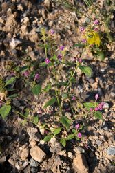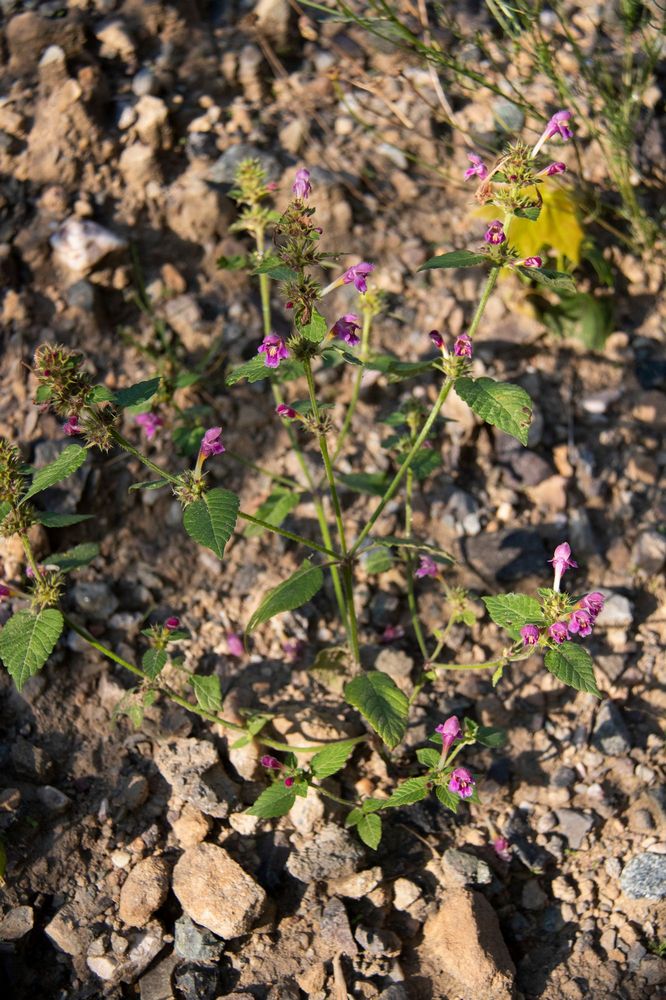 Jednoletá rostlina s jednoduše chlupatou lodyhou vysokou 20 až 50 cm, která vyrůstá z poměrně krátkého, rozvětveného kořene. Lodyha je mírně čtyřhranná, již od báze bohatě větvená, pod uzlinami je mírně ztlustlá, v horní části má stopkaté žlázky s tmavě červeným sekretem a celá je hustě pýřitě chlupatá. Je porostlá vstřícnými, křižmostojnými, řapíkatými, celistvými listy dlouhými 4 až 10 cm a širokými 2 až 4 cm. Jejich čepel je vejčitá až vejčitě kopinatá, na bázi srdčitá až široce klínovitá, po okraji má deset až dvacet párů drobných pilovitých zoubků, na svrchní straně je přitiskle chlupatá a na spodní má světle žluté žlázky.