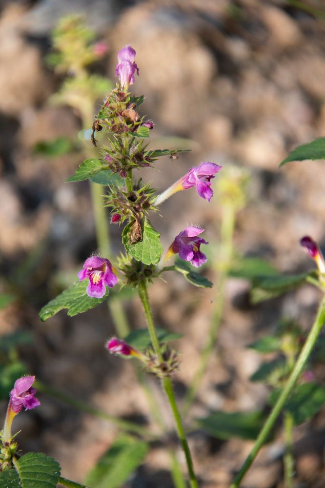 Na vrcholu hlavní lodyhy i větví vyrůstají květy ve dvou až osmikvětých lichopřeslenech v několika řadách nad sebou, jejich listeny jsou jen drobné a listence čárkovité s hrotem. Květy jsou souměrné, oboupohlavné, pyskaté. Kalich je zvonkovitý, pěticípý, až 10 mm dlouhý, vně červená kališní trubka je stejně dlouhá jako hrotité kališní cípy s červenými žlázkami. Koruna je dvoupyská, chlupatá, 15 až 25 mm dlouhá, téměř třikrát delší než kalich, je purpurová či růžovofialová s tmavší kresbou na středním čtvercovém, slabě vykrojeném laloku dolního trojdílného pysku. Svrchní dvouplodolistový semeník je přepážkou rozdělen na čtyři pouzdra, v každém je po vajíčku, ukončen je delší čnělkou s dvouramennou bliznou, u jeho báze jsou žlázky vylučující nektar. Květy jsou samosprašné a jsou opylovány hmyzem.