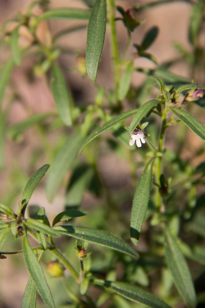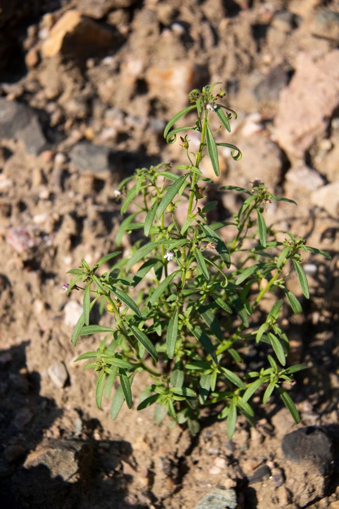 Jednoletá, 5 až 30 cm vysoká bylina s chlupatou, přímou nebo vystoupavou, bohatě rozvětvenou lodyhou. Listy jsou vespod lodyhy vstřícné a výše střídavé, téměř přisedlé, kopinaté až čárkovité, u báze klínovité, na vrcholu tupé a po obvodě celistvé. Bývají dlouhé do 35 mm, široké do 5 mm a jsou oboustranně žláznatě chlupaté.