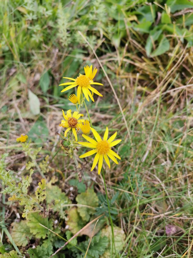 Sytě žluté květní úbory na stopkách asi 1 cm dlouhých mívají v průměru 15 až 20 mm a jsou poskládány do chocholičnaté laty. Na bezplevném květním lůžku vyrůstají dvojaké kvítky, v terči 60 až 80 oboupohlavných s pětizubou trubkovitou korunou a po obvodě 12 až 15 pestíkovitých jazykovitých s asi 10 mm dlouhou ligulou se třemi zoubky. Gyneceum je složeno ze dvou plodolistů, trubkovité kvítky mají po pěti tyčinkách. Úbory mají široce zvonkovitý, 5 až 10 mm dlouhý, často nahnědlý jednořadý zákrov tvořený asi 13 zelenými, podlouhle kopinatými listeny a na bázi je asi poloviční počet drobných listenů zákrovečku. Kvete od července do září.