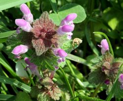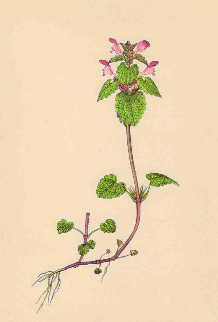 Je to jednoletá nebo dvouletá bylina 10 až 30 cmvysoká. Lodyha často od báze větvená, vystoupavá, fialově naběhlá, lysá, čtyřhranná. Listy jsou křižmo vstřícné, spodní s řapíky 5-100 mm dlouhými, horní přisedlé, čepel vejčitá až okrouhle nebo trojúhelníkovitě vejčitá, řídce chlupatá, vroubkovaná až vroubkovitě pilovitá, často svraštělá a do červena naběhlá. Květy v 6 až 10květých lichopřeslenech (zkrácené vijany), kalich je pěticípý neopadavý, koruna dvoupyská, růžově purpurová, vzácně bílá, korunní trubka rovná, horní pysk vyklenutý, kratičce pýřitý, dolní pysk purpurově skvrnitý. Plody jsou šedé tvrdky. Kvete od března do konce září.