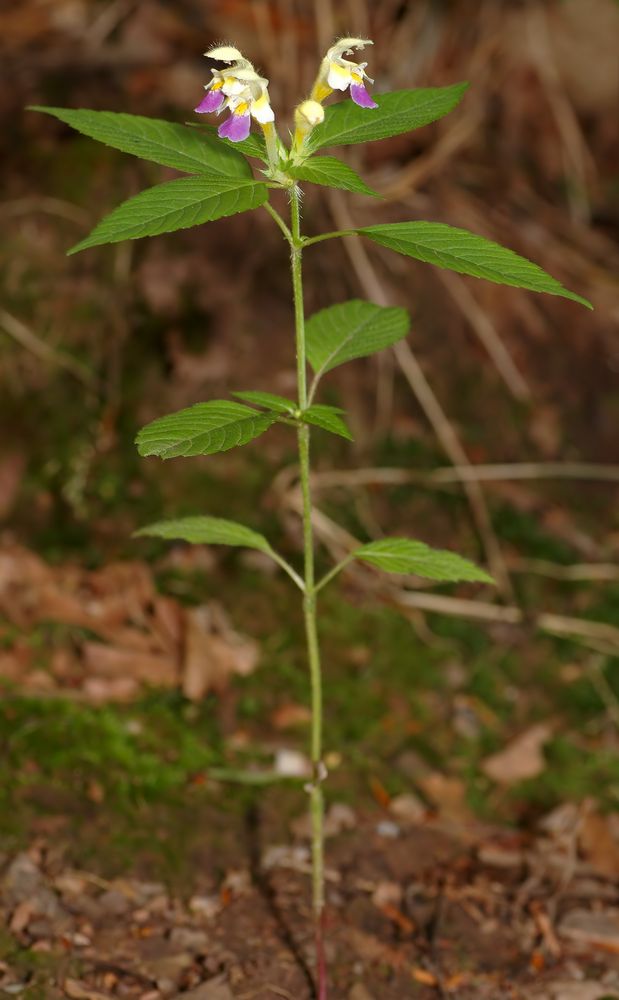Je to jednoletá, 60 až 150 cm vysoká bylina s lodyhou větvenou, chlupatou až lysou, někdy s voskovým povlakem. Listy jsou řapíkaté, čepel vejčitě kopinatá, zubatá, řídce chlupatá. Květy skládají 4 až 14květé lichopřesleny, koruna je až 40 mm dlouhá, chlupatá, žlutá, střední lalok dolního pysku je fialový, na okraji se žlutým lemem a v jeho ústí se nachází žlutá skvrna s fialovou kresbou, postranní dolní laloky na špičce jsou obvykle bílé. Kvete od června do září.