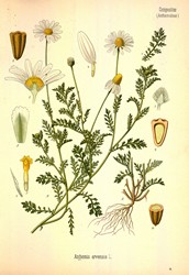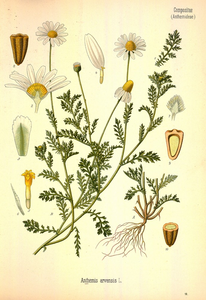 Je to jednoletá bylina s vřetenitým, tenkým kořenem a pýřitě vlnatou až skoro lysou, vzpřímenou, většinou bohatě rozvětvenou, 10 – 50 cm vysokou lodyhou, jejíž jednotlivé větve jsou prodlouženy a nesou pravidelně dvakrát peřenosečné vejčité úkrojky, jež jsou peřenoklané, špičaté, 0,5 – 1 mm široké. Vřeteno listů je nezubaté. Úbory jsou jednotlivé na dlouhých stopkách, 2 – 3 cm v průměru, s terčem měřícím 5 – 7 mm v průměru, se zákrovem skoro polokulovitým, složeným ze střechovitě uspořádaných, podlouhlých, vlnatě pýřitých, bledých a na špičce hnědě blanitě lemovaných listenů. Lůžko úborů je kuželovité, na celém povrchu porostlé kopinatými, celokrajnými a ostře přišpičatělými plevkami. Kvítky v terči jsou zlatožluté, oboupohlavné, s rourkou korunní dole ztluštělou a nahoře pěticípou, pravidelnou. Tyčinek je 5. Jazykovité květy na okraji úborů jsou samičí v počtu 5- 8 nebo 13, s korunou bílou, podlouhle čárkovitou, až 12 mm dlouhou. Plodem je nažka čihovitého tvaru, podélně rýhovaná, nahoře se svalovitým, u vnitřních nažek často blanitým lemem na temeni, který tvoří kroužek. Kvete od června do září.