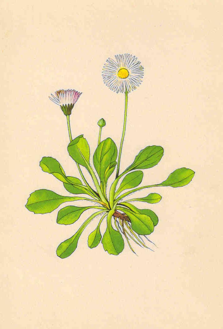 Je to malá, vytrvalá bylina, 4 - 15 cm vysoká, lysá nebo chlupatá, s krátkým, válcovitým a šikmým oddenkem, tvořící trsy. Všechny listy jsou přízemní a skládají dosti bohatou růžici. Jsou podlouhle obvejčité až kopisťovité, na konci zaokrouhlené a k dolejšku klínovitě zúžené v dosti široký řapík, na okraji oddáleně vroubkované s jedním nervem, krátce chlupaté až lysé. Krátce a přitiskle chlupatý stvol nese jeden úbor, měřící v průměru 16 - 30 mm. Lůžko úboru je duté a kuželovité, na povrchu jamkaté, bez plenek. Bylinné pýřité listeny tvoří vně úboru dvouřadý zákrov. Terč úboru (žlutý střed) měří 4 - 5 mm v průměru a nese četné žluté, oboupohlavné kvítky, které mají pěticípou, rourkovitě zvonkovitou korunu, pět tyčinek a spodní semeník s dlouhou čnělkou. Okrajové kvítky úboru jsou samičí a mají jazykovitou, 8 - 12 mm dlouhou, bílou, na konci často narůžovělou korunu. Ze spodního semeníku obojích kvítků vyvinují se za plodu nažky, jež jsou lysé a bez chmýru. Kvete od března do listopadu, a je-li mírná zima, dokonce po celou zimu i pod sněhem. Za vlhkého počasí a v noci se úbory zavírají a to tak, že se zákrovní listeny a jazykovité květy okrajové zdvíhají vzhůru a přikládají k sobě. Během dne se otáčejí úbory ke slunci a celý úbor se pohybuje pomalu od východu na západ.