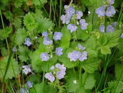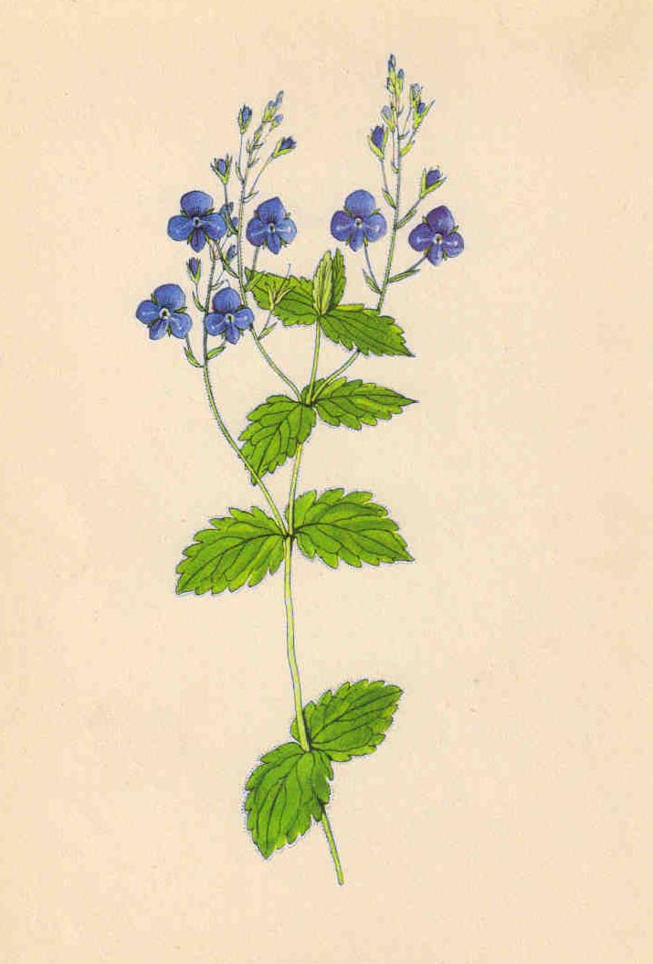 Je to vytrvalá bylina s válcovitým plazivým oddenkem, z něhož vyrůstají vystoupavé, 10 - 40 cm vysoké, většinou jednoduché lodyhy, jež jsou dvouřadě chlupaté. Listy jsou vstřícné, vejčité, špičaté, spodní krátce řapíkaté, prostřední a horní přisedají zaoblenou nebo trochu srdčitou bází. Na okraji jsou vroubkovaně zubaté, svrchu skoro lysé, vespod roztroušeně až hustě drsně chlupaté. Kvítky skládají volné, ale dosti bohaté odstávající hrozny, jež vyrůstají z úžlabí hořejších listů. Květní stopky jsou vždy vzpřímené a 1 - 2krát delší než listeny, v jejichž paždí vyrůstají. Jsou krátce žláznatě chlupaté, podobně jako vřeteno hroznů. Kalich květní je 4dílný a kolovitá, azurově modrá (zřídka růžová nebo bílá) koruna je čtyřcípá, v ústí trubky bílá, 10 - 14 mm v průměru velká; hořejší cíp, který vznikl srůstem původních dvou, je větší. Korunní rourka není skoro vyvinuta. Tyčinky jsou dvě. Semeník se za plodu mění v dvoupouzdrou, plochou, trojhranně obsrdčitou, 3 - 4 mm dlouhou tobolku, která obsahuje plochá, vejčitá semena. Kvete od května do října.