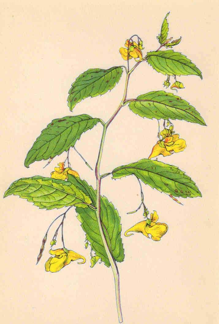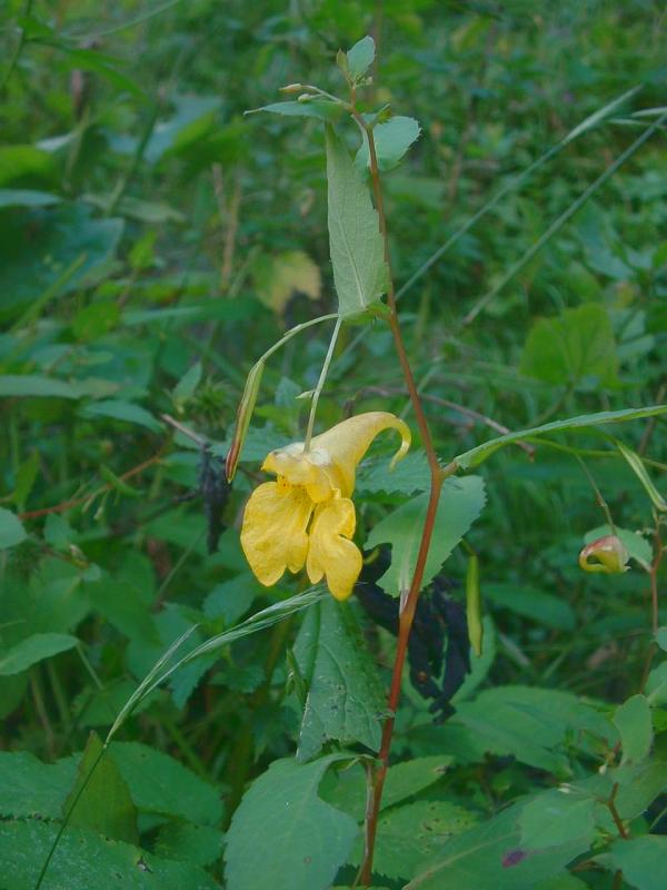 Je to jednoletá, až metr vysoká rostlina s přímými, od poloviny větvenými lodyhami, které bývají v dolní části nápadně uzlovitě ztlustlé. Celá rostlina je velmi šťavnatá a snadno vadne. Střídavě postavené listy jsou vejčitě podlouhlé, zašpičatělé, na okrajích zubaté a naspodu mají několik žlázek. Nápadné nicí, až 4 cm veliké květy mají žlutavý kalich, protažený v dlouhou, zakřivenou ostruhu. Zlatožutá koruna je v ústí červeně tečkovaná. Květy tvoří chudé úžlabní hrozny. Plody jsou válcovité tobolky, které ve zralosti při dotyku pukají, rychle se smršťují a zavinují dovnitř. Smrštěním jsou semena vystřelována do okolí. Kvete od července do srpna.